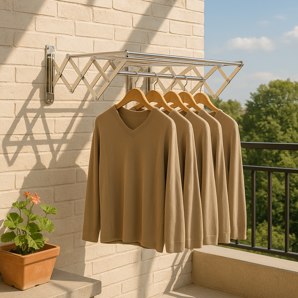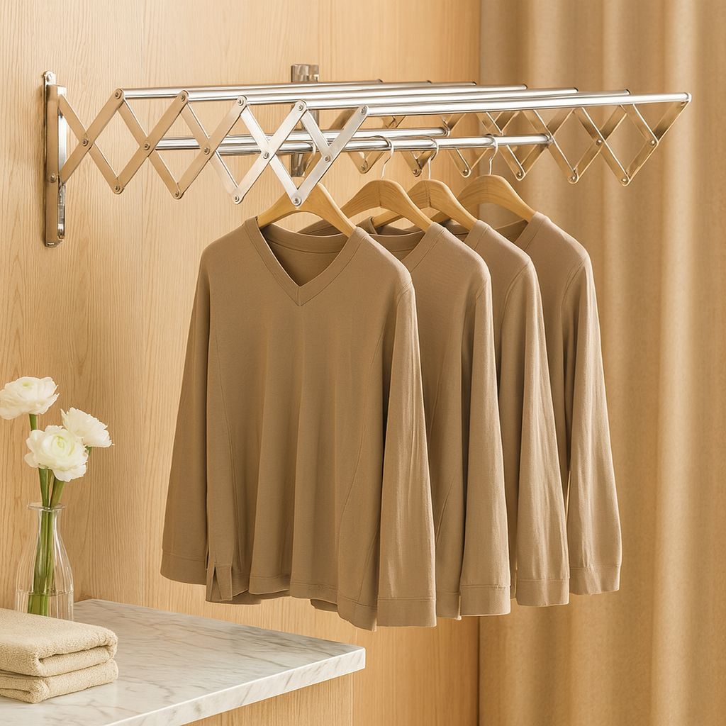 Verwandle deine Wäsche-Routine mit dem AeroFold | Platzsparender Wand-Wäscheständer. Entwickelt für modernes Wohnen kombiniert dieser klappbare, wandmontierte Wäscheständer praktische Funktionalität mit schlankem Minimalismus. Er spart wertvollen Bodenplatz und sorgt gleichzeitig für Ordnung. Ideal für Badezimmer, Waschräume oder Balkone – AeroFold macht das Trocknen von Kleidung mühelos und stilvoll.
