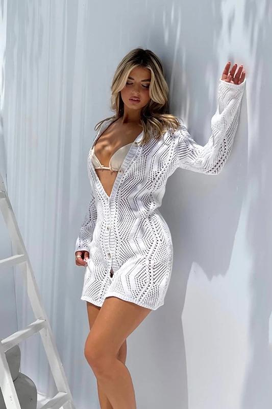 Entworfen mit einer lockeren, entspannten Passform, ermöglicht der Alana Strandüberwurf Freiheit in der Bewegung, während Sie fantastisch aussehen. Sein gehäkeltes Muster fügt Textur und Details hinzu, sodass Sie in jeder sonnigen Umgebung auffallen. Kombinieren Sie es mit Ihrem Lieblingsbikini oder einem einfachen Sommerkleid für einen Look, der sowohl modisch als auch praktisch ist.