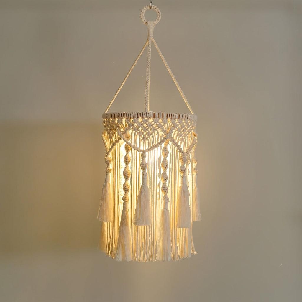 Diese Pendelleuchte ist mit einem zylindrischen Schirm entworfen und kunstvoll aus rohem, weißen Makramee-Schnur handgefertigt. Ihr kompliziertes Knotenmuster fügt Textur und Tiefe hinzu, während die fließenden Quastenfransen ihren Boho-Charme unterstreichen. Ein perfektes Stück, um Wärme und künstlerische Note in Ihren Raum zu bringen.