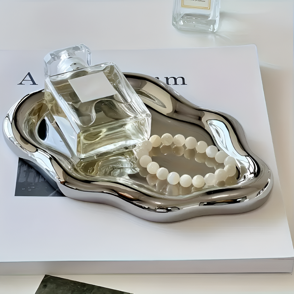 Ideal dimensioniert für tägliche Notwendigkeiten, bietet das CloudElegance Tablett sowohl Funktion als auch Schönheit. Es eignet sich perfekt zum Aufbewahren von Ringen, Armbändern, Ohrringen oder kleinen Erinnerungen auf eine saubere und aufgeräumte Weise. Ob alleinstehend oder in Kombination mit anderen Tabletts, es bereichert Ihren Raum mit stiller Eleganz.