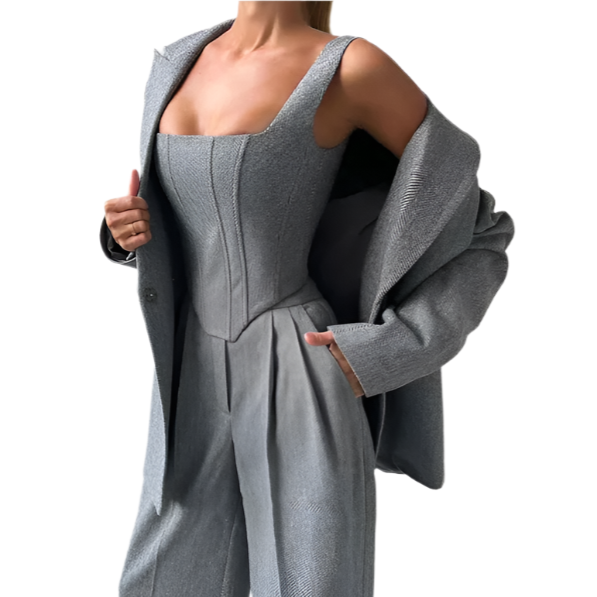 Dieses schön abgestimmte Set umfasst ein weiches, ärmelloses Top, eine locker geschnittene Hose und ein stilvolles Langarm-Oberteil. Jedes Teil ergänzt sich gegenseitig, was Ihnen ermöglicht, sie einfach zu stylen und zu kombinieren. Perfekt für Übergangssaisons – das Demi-Set balanciert Komfort und feminine Anmut. Tragen Sie es zusammen oder getrennt für unendliche Stylingmöglichkeiten.