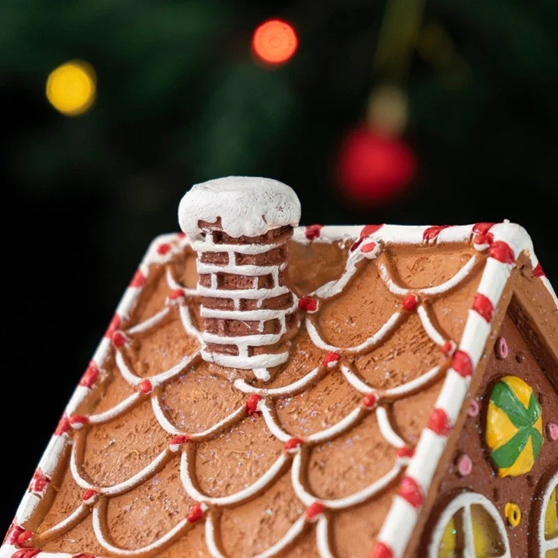 Feiere die Feiertage mit der Dekoration des Lebkuchenhauses. Mit komplizierten, süßigkeitenähnlichen Details, frostigen Dächern und charmanten Fenstern, perfekt für Kaminsimse, Tischplatten oder Ferienzentren.