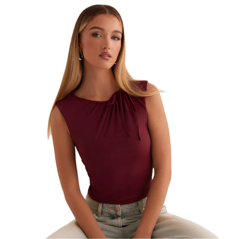 Freya - Verspielte Schulterrüschen und Knoten sind die Bluse, die sofort die Aufmerksamkeit auf sich zieht. Die feinen Schulterrüschen und der romantische Vorderknoten verleihen einen verspielten und femininen Ausdruck, der dein Outfit einzigartig macht. Das Design betont deine Silhouette und sorgt gleichzeitig für Bewegung und Leichtigkeit – perfekt für den Alltag und abends.