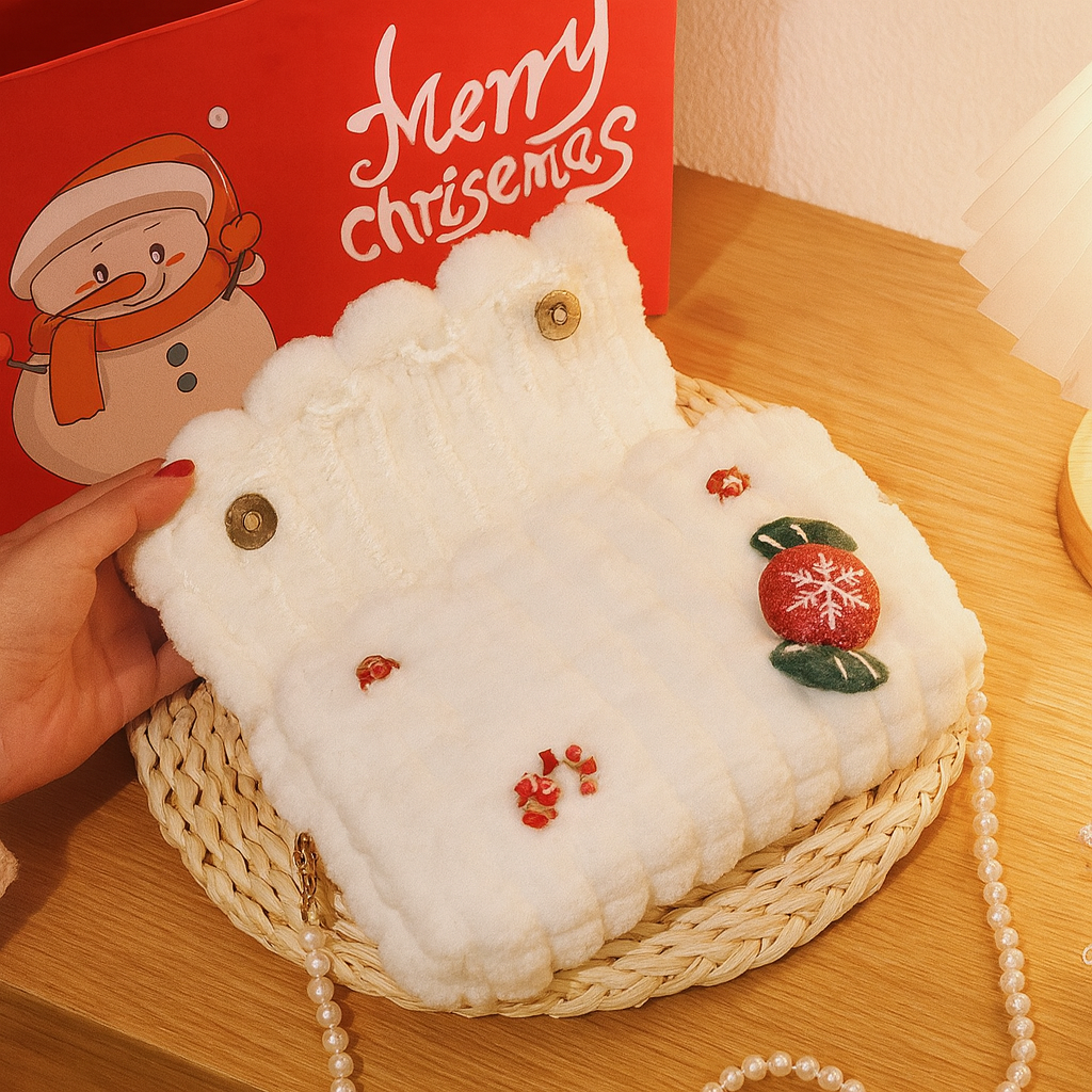 Feiere die Weihnachtszeit mit Stil mit der Glacienne | Weihnachts-Umhängetasche mit Pelzbesatz. Diese charmante Umhängetasche vereint verspielte Weihnachtsstimmung mit gemütlicher Eleganz und ist das perfekte Accessoire, um winterliche Tage und festliche Abende zu verschönern. Mit ihrem weichen Pelzbesatz und dem detailreichen Flechtdesign ist sie sowohl praktisch als auch magisch – ein Stück, das dein saisonales Outfit mühelos vollendet.