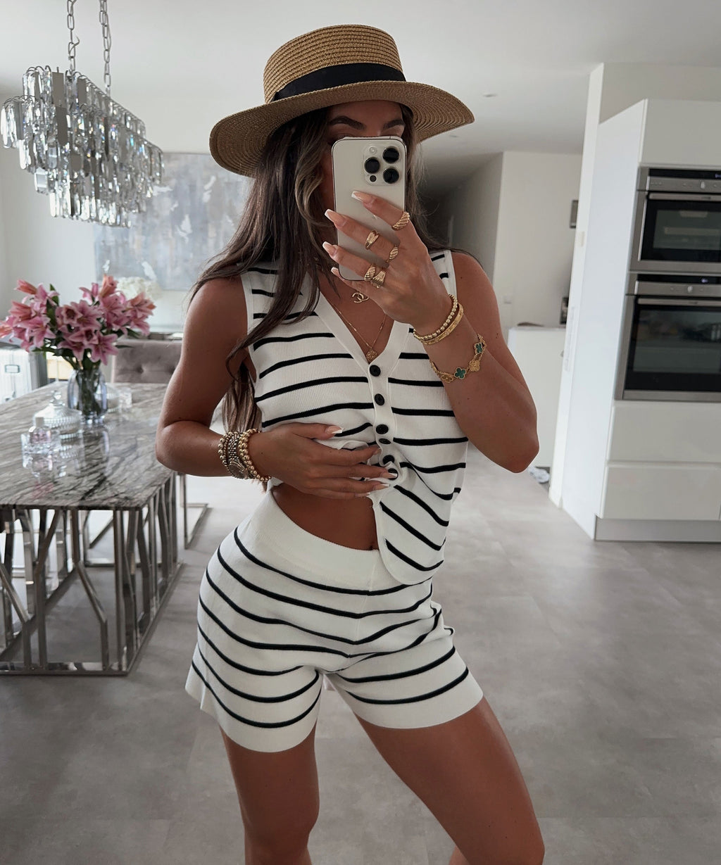 Hailee - Gestreiftes Top und kurzer Satz bieten ein verspieltes, aber stilvolles Ensemble, perfekt für warmes Wetter. Mit ihrem einzigartigen gestreiften Muster verspricht dieses Set, dich schick und komfortabel zu halten, egal ob du am Strand bist oder Besorgungen machst. Der weiche Stoff sorgt für eine kühle, lässige Passform, die dich den ganzen Tag über wohlfühlen lässt.