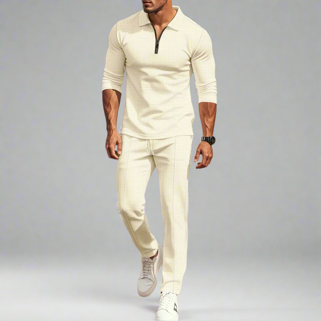 Das einfarbige Oberteil mit halbem Reißverschluss ergänzt perfekt die passende Hose. Zusammen ergibt sich ein lässiger, dennoch strukturierter Look – perfekt für Freizeit, Spaziergänge oder entspannte Treffen.