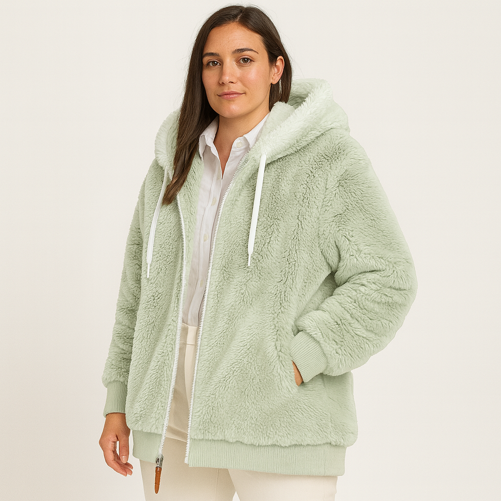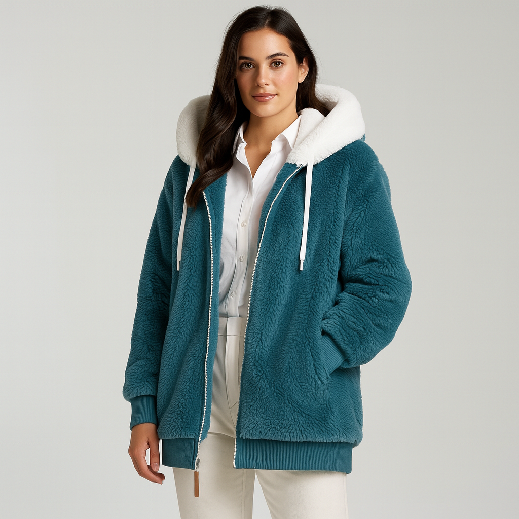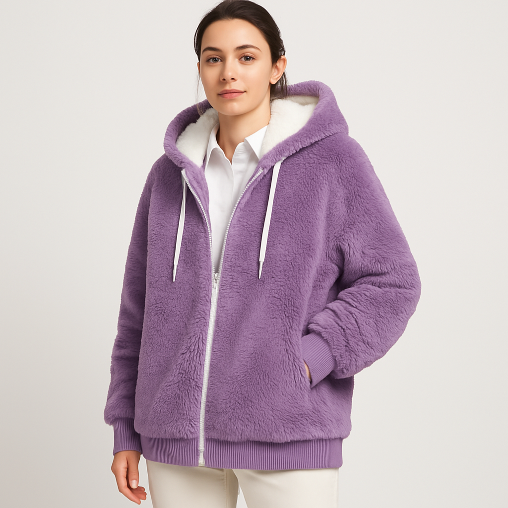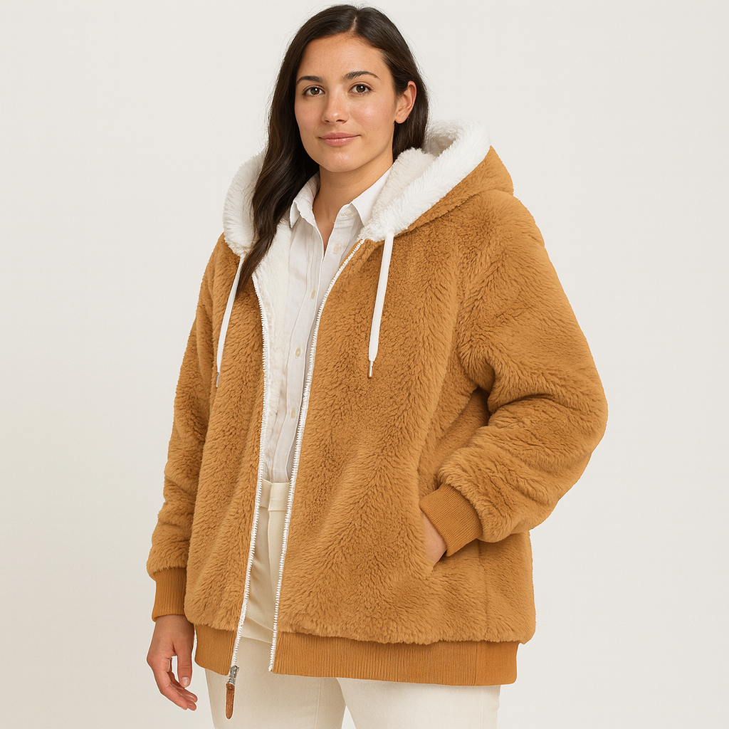 Mit einfachem Reißverschluss und Kapuze gestaltet, ist dieser Mantel vielseitig kombinierbar. Seine weiche Plüschstruktur und das lässige Design machen ihn ideal für tägliche Outfits in der kalten Jahreszeit.