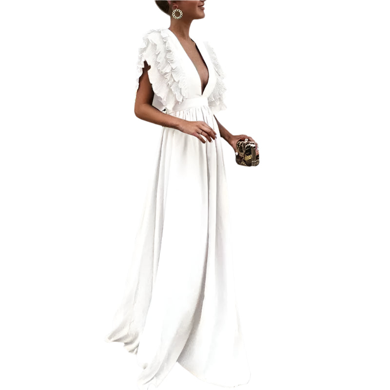 Das LuxeFlair Maxikleid ist so gestaltet, dass es mit seinem tiefen V-Ausschnitt, dem schwingenden Saum und den sanften Rüscheärmeln Köpfe verdreht. Egal, ob für eine formelle Veranstaltung, eine Sommerfeier oder ein elegantes Abendessen, bringt dieses lange Kleid Anmut und Charme bei jedem Schritt mit seinem schmeichelhaften Fall und femininen Charme.