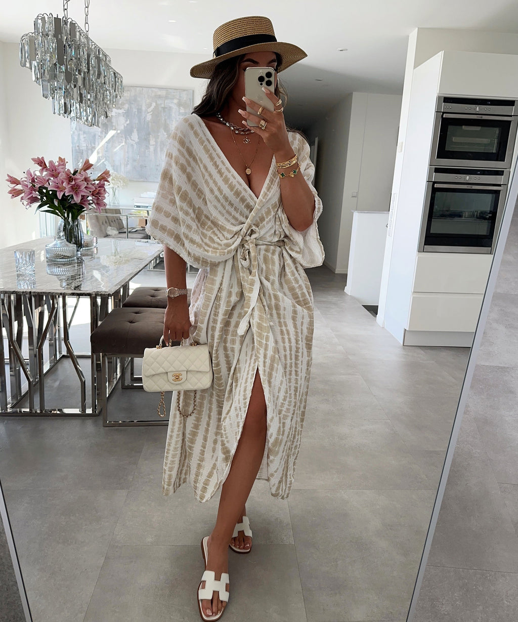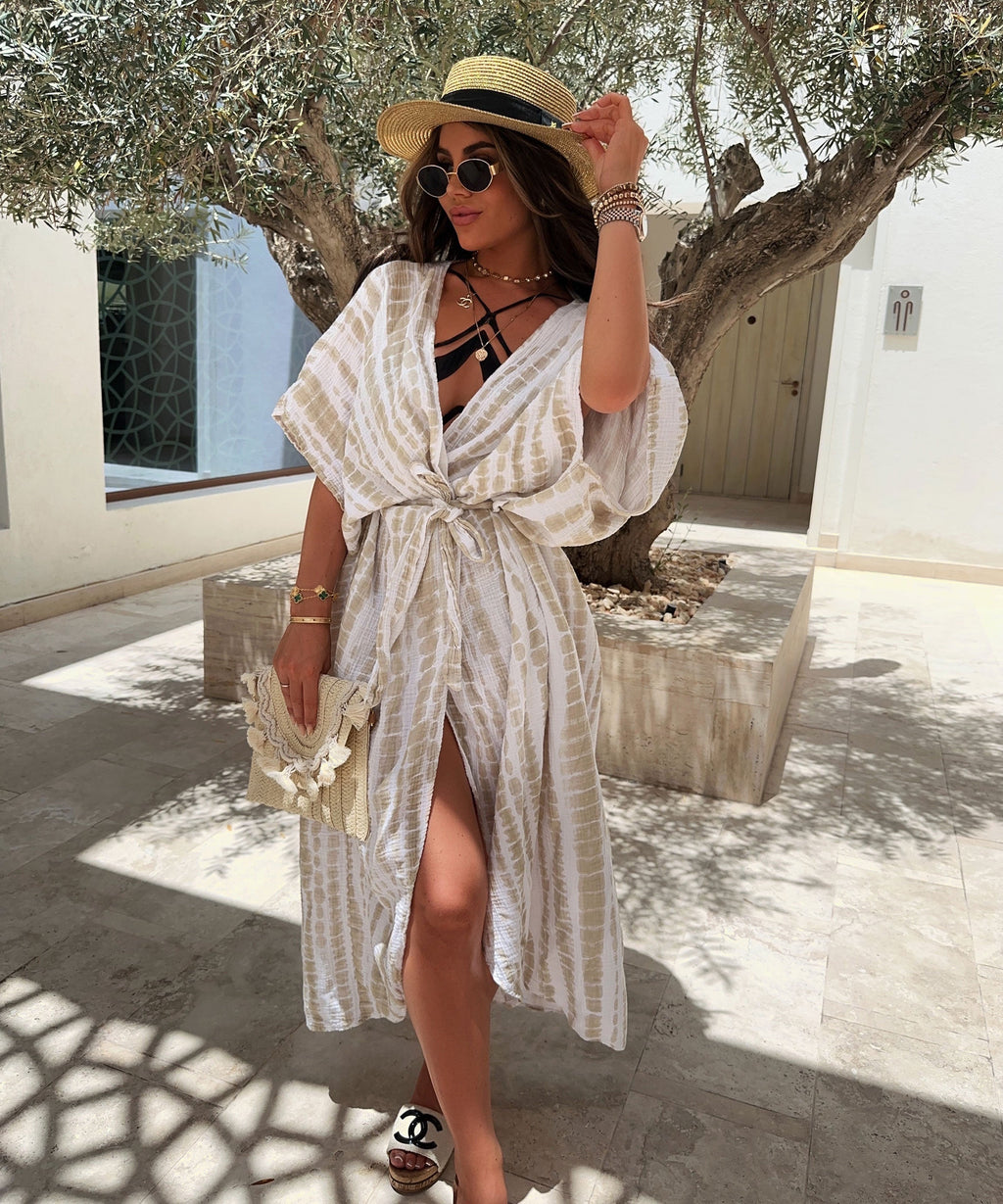 Malorie - Beigefarbenes Schlangenprint Sommer-Cover-up verleiht Ihrer Sommergarderobe einen Hauch von raffiniertem Stil. Das elegante Schlangenprint und das leichte Design machen es zur perfekten Ergänzung für Ihren Strand- oder Poollook.