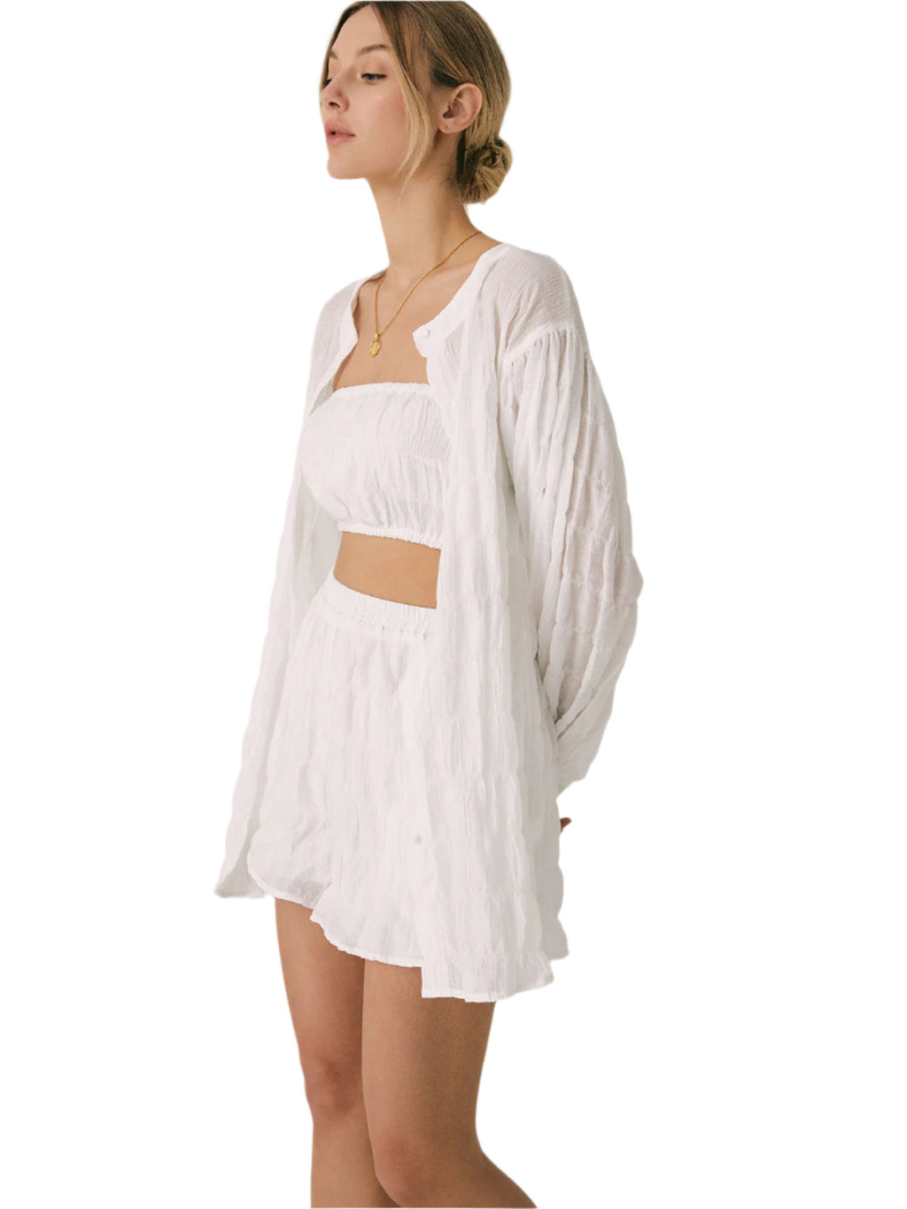 Egal, ob Sie sich zu Hause entspannen, einen Spaziergang in der Stadt machen oder ein Brunch mit Freunden genießen, dieses Set sorgt dafür, dass Sie dies mit Komfort und Stil tun. Das passende Top, die Shorts und die leichte Bluse harmonieren perfekt miteinander, können jedoch auch je nach Stimmung und Anlass einzeln gestylt werden. Es ist die ideale Wahl, wenn Sie gut aussehen möchten, ohne viel Aufwand.