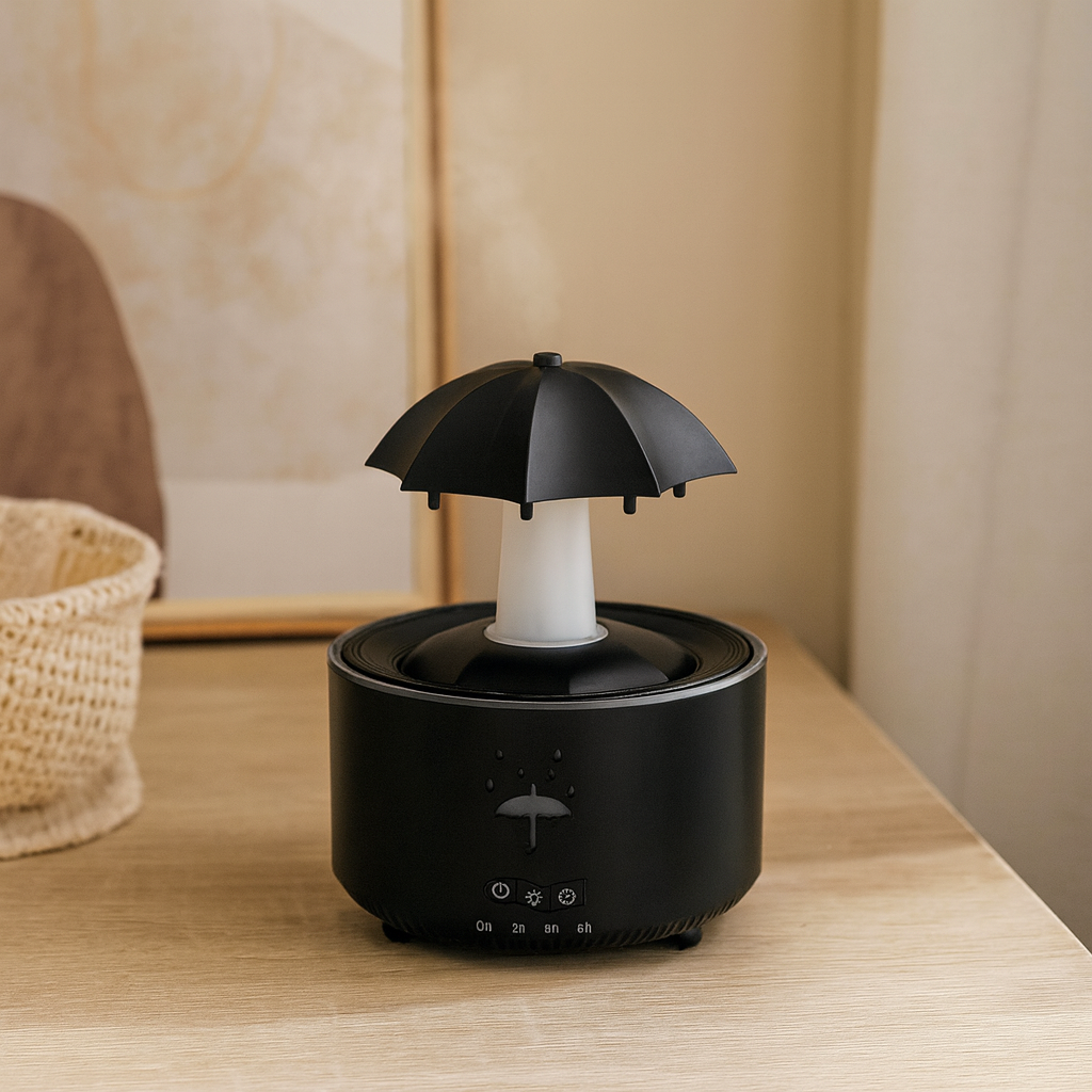 Dieser Luftbefeuchter mit rotierendem Regenschirm und Wassertropfeneffekt bringt Bewegung und Ruhe in jeden Raum. Sanfter Nebel kombiniert sich mit bunten Nachtlichtern und schafft eine beruhigende Atmosphäre für Schlafzimmer und Wohnzimmer.