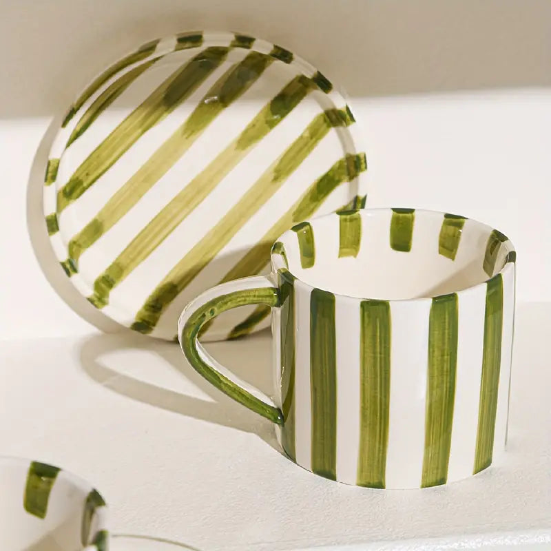 Verleihen Sie Ihrem Geschirr Persönlichkeit mit Sip&Stripe – einer auffälligen Tasse mit passendem gestreiftem Teller. Dieses charmante Set hebt sofort Ihre Kaffee- oder Teepause mit seinem lebhaften gestreiften Design und der perfekten Kombination. Entworfen, um sowohl funktional als auch stilvoll zu sein – perfekt für Sie, die spielerische Eleganz im Alltag lieben.