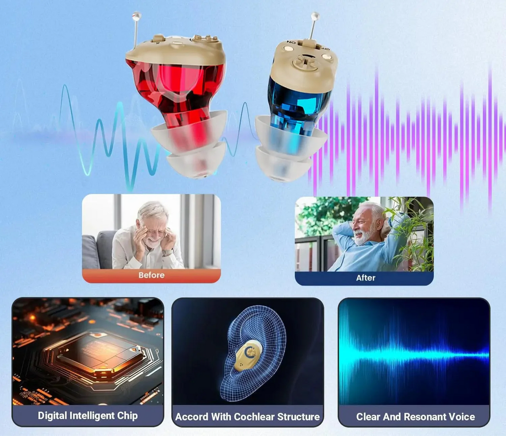 Dieses kompakte und kabellose Hörgerät ist so konzipiert, dass es das Hören mit einem leistungsstarken Klangverstärker verbessert. Perfekt für ältere Menschen und Personen mit Hörverlust, die eine diskrete und bequeme Lösung suchen.