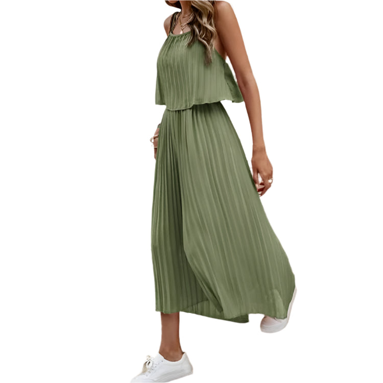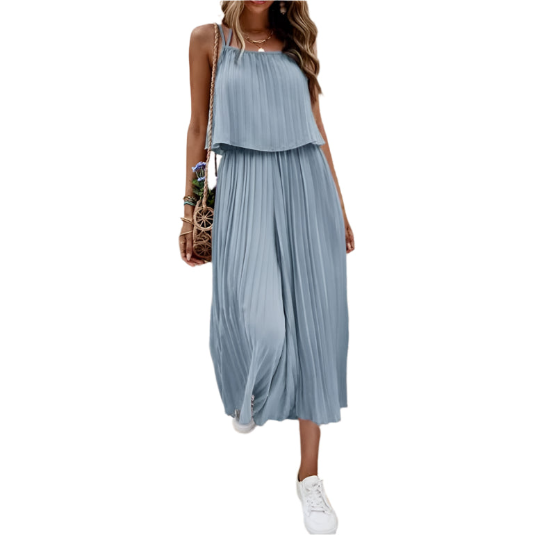 Mit seinem lockeren Schnitt und fließenden Falten bietet dieses Ensemble Bewegungsfreiheit und einen schmeichelhaften Fall. Das ärmellose Top sorgt für Luftigkeit, während der lange Rock mit jedem Schritt anmutige Bewegung hinzufügt. Kombinieren Sie es mit Sandalen, einem Sonnenhut oder einer leichten Strickjacke für einen mühelos eleganten Sommerlook.